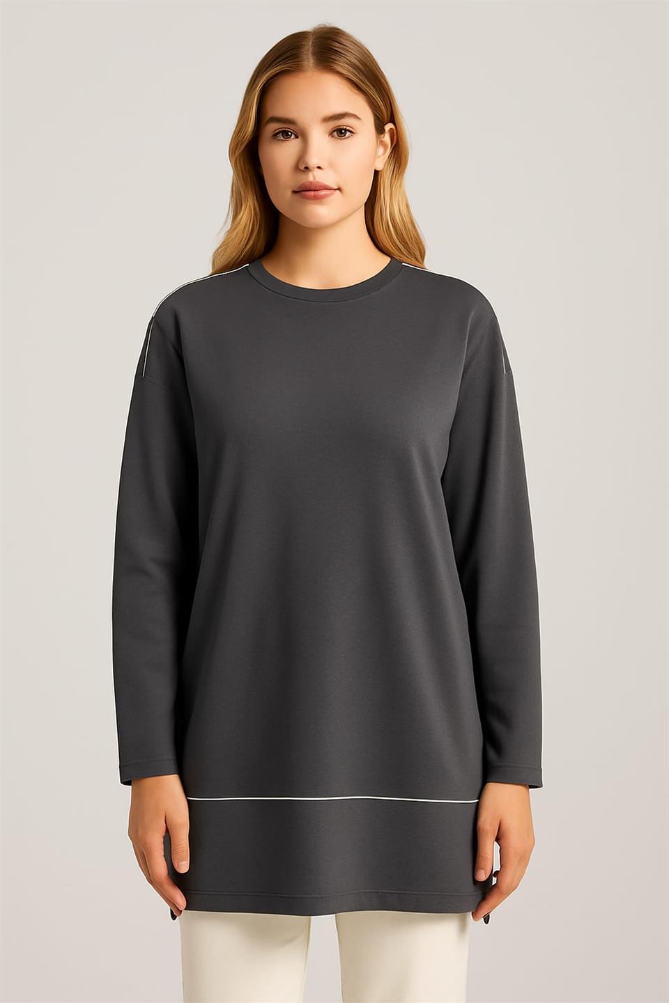 Kadın Büyük Beden Füme, Bisklet Yaka, Omuz Ve Ön Biye Detaylı, Yanyırtmaçlı Sweatshirt 65N39148 (65N39148)