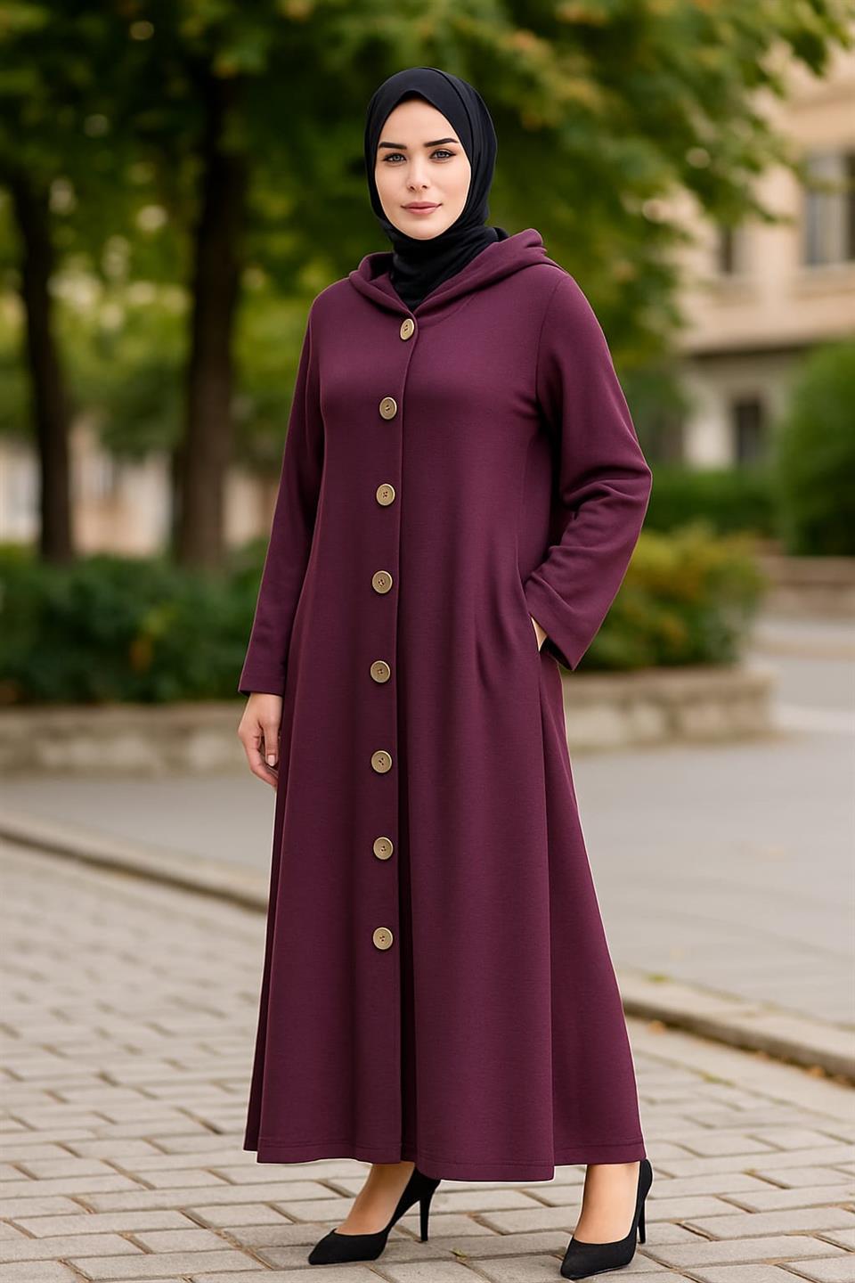 Kadın Büyük Beden Mor, Kapüşonlu, Yan Cepli Ön Boy Düğmeli Uzun Kap 65N39146 (65N39146)