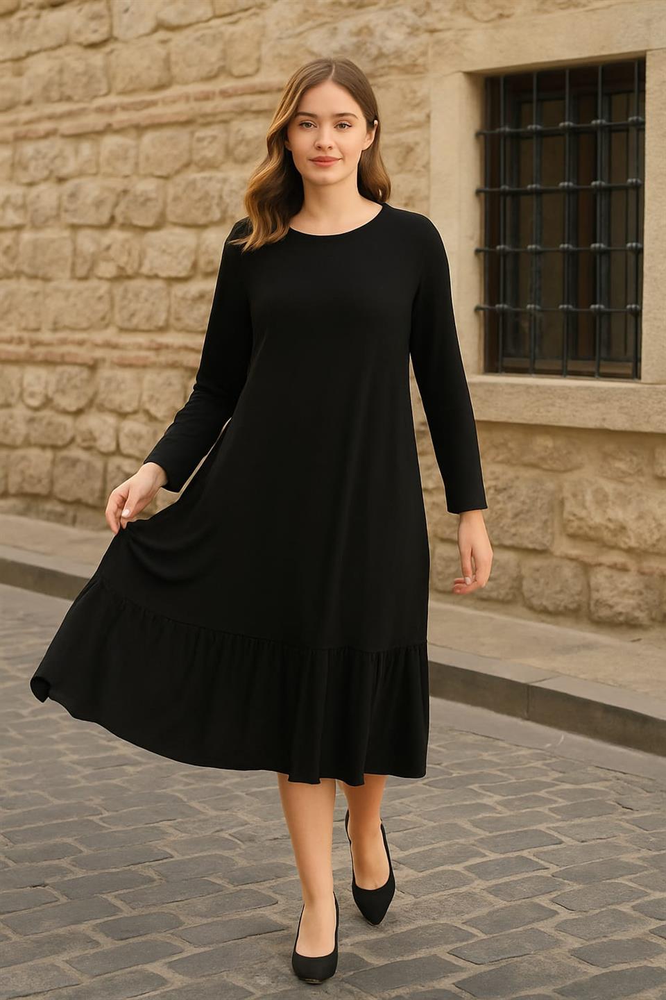 Kadın Büyük Beden Siyah, Bisiklet Yaka, Etek Ucu Katlı, Cepli Viskon Elbise 65N39153