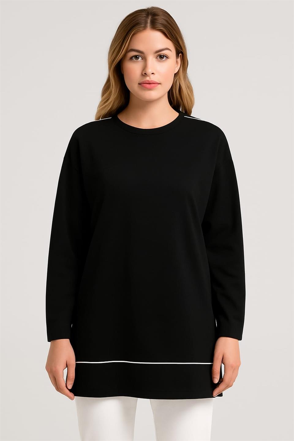 Kadın Büyük Beden Siyah, Bisklet Yaka, Omuz Ve Ön Biye Detaylı, Yanyırtmaçlı Sweatshirt 65N39148 (65N39148)