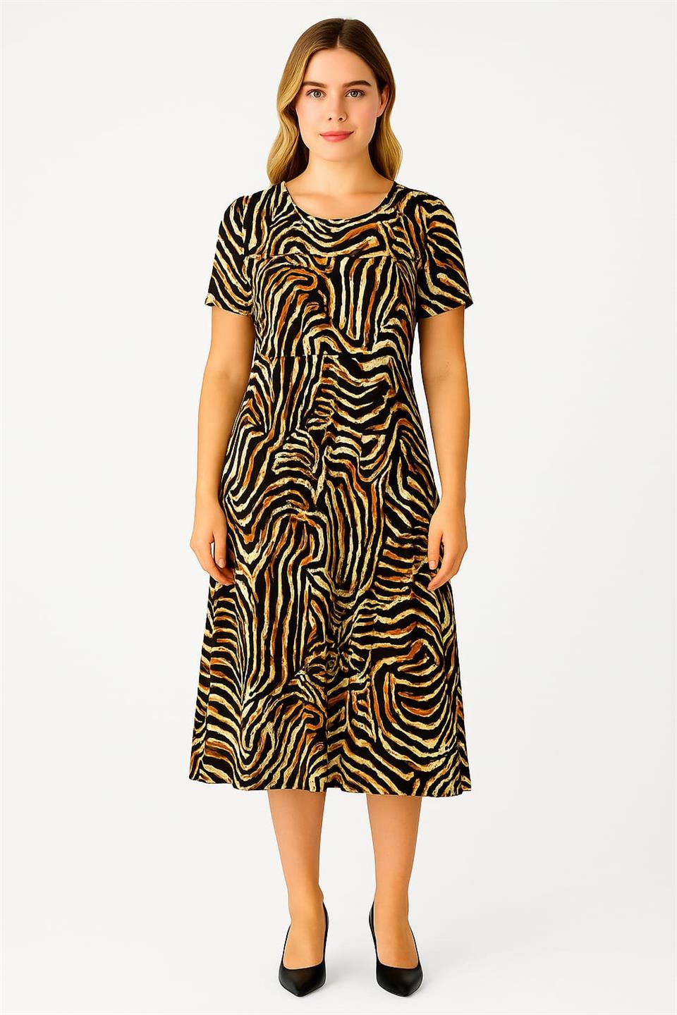 Kadın Büyük Beden Vizon, Zebra Desenli , Bisiklet Yaka Viskon Elbise 65N39156 (65N39156)