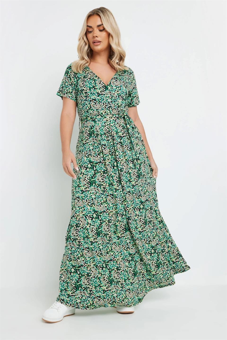 Kadın Büyük Beden Yeşil, Anvelop Yaka, Desenli Viskon Uzun Elbise 65N39135