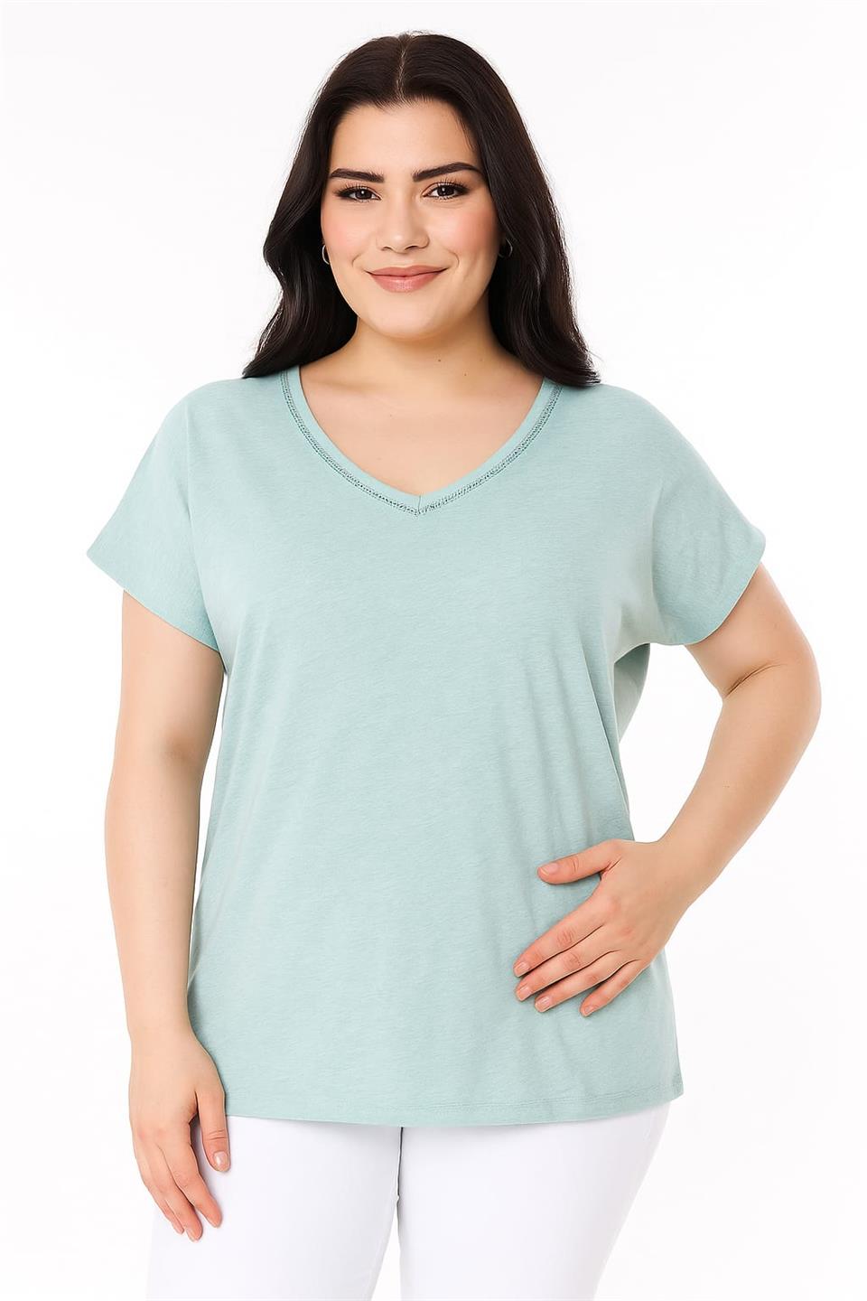 Kadın Büyük Beden Açık Mavi, Yaka Delik Detaylı , Yıkamalı Kumaş, V Yaka Bluz 65N39137 (65N39137)