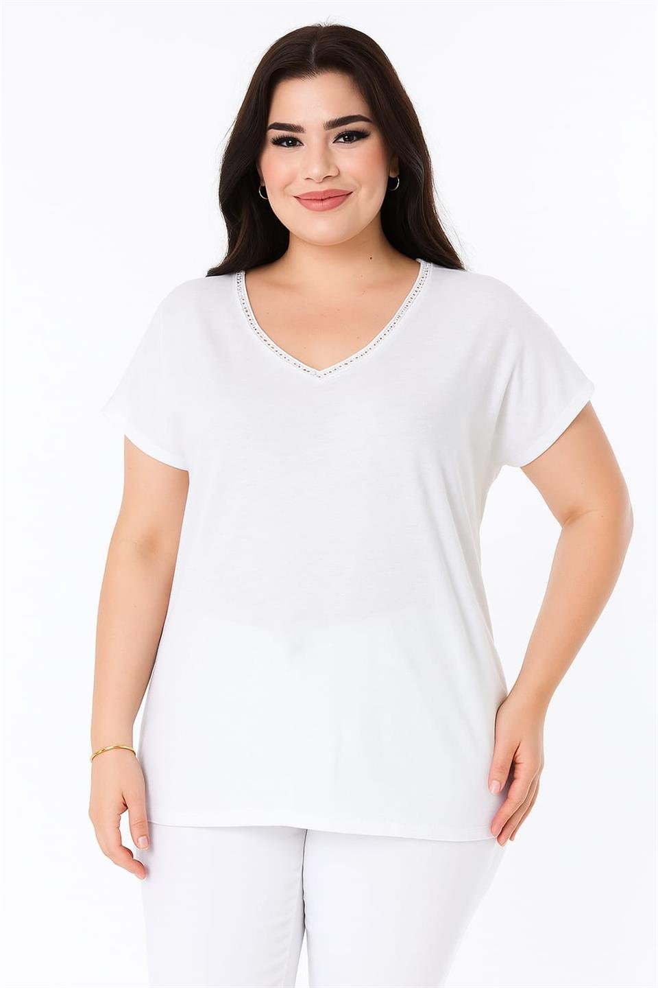 Kadın Büyük Beden Beyaz, Yaka Delik Detaylı , Yıkamalı Kumaş, V Yaka Bluz 65N39137