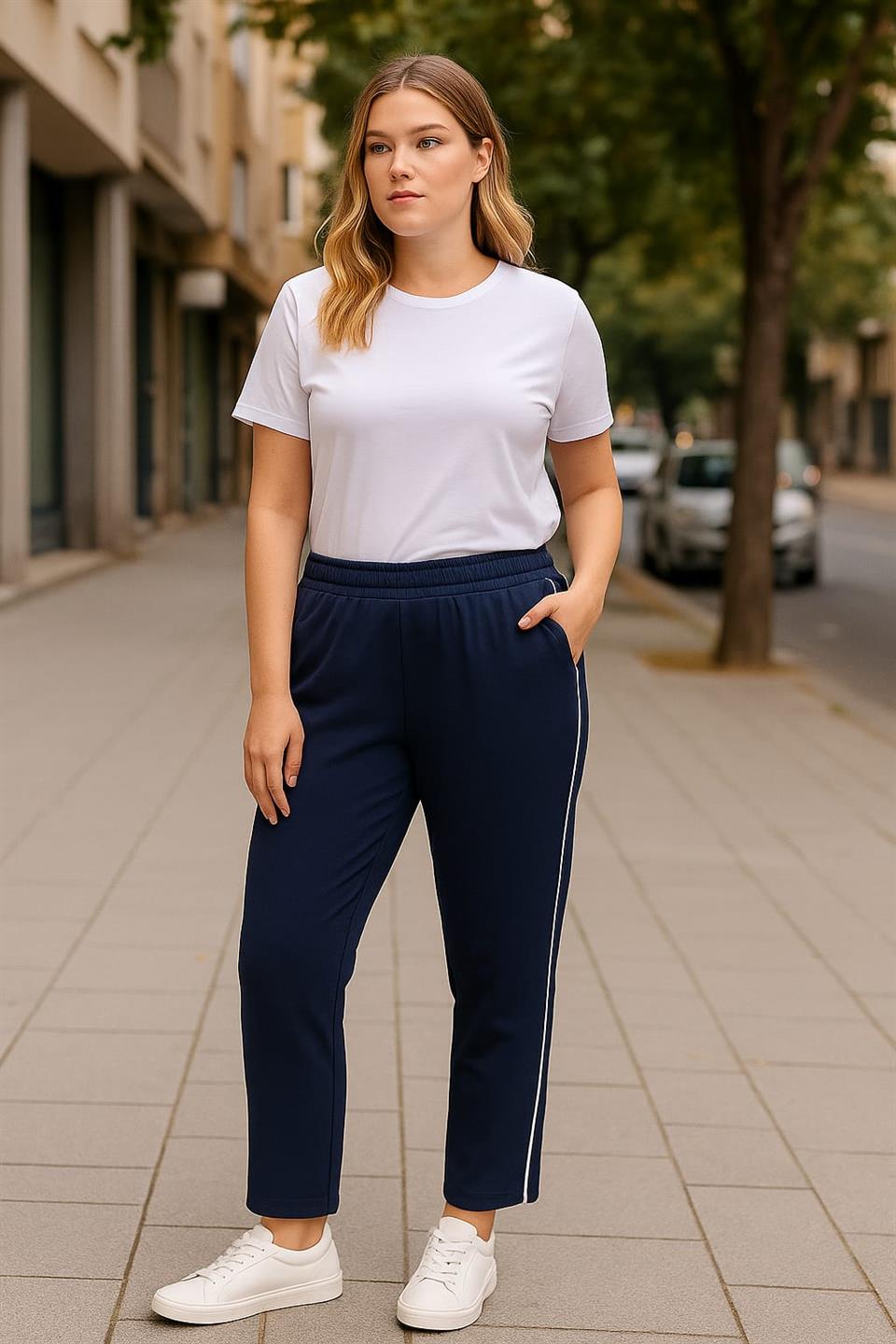 Kadın Büyük Beden Lacivert Bel Lastikli Biye Detaylı Paça Minik Yırtmaçlı Cepli Eşofman Alt 65N39149