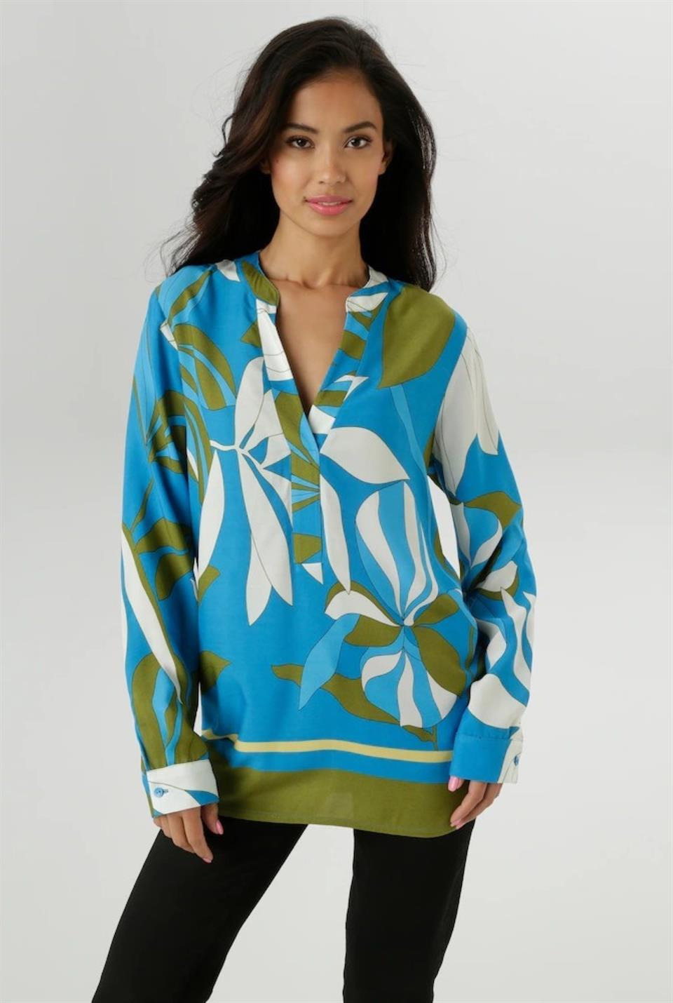 Kadın Büyük Beden Saks Mavi-Yeşil-Beyaz, V Yaka Çiçek Desenli Dokuma Viskon Bluz 65N39107