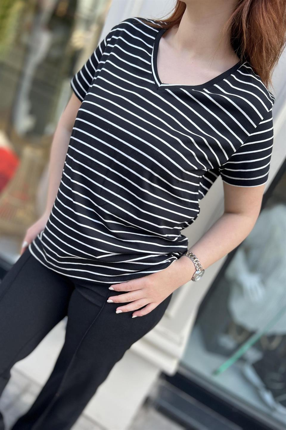 Kadın Büyük Beden Siyah, Pamuklu Kumaş, V Yaka Çizgili Bluz 65N39094